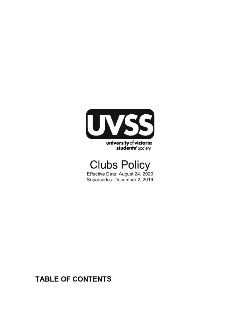 Clubs Policy Effective Date: August 24, 2020, Supersedes: December 2, 2019TABLE OF CONTENTSPART 1: PREAMBLE2PART 2: GOVERNANCE22.1CATEGORIES22.2MEMBERSHIP22.3RATIFICATION AND STATUS22.4SPACE BOOKINGS32.5STORAGE32.6EXECUTIVE