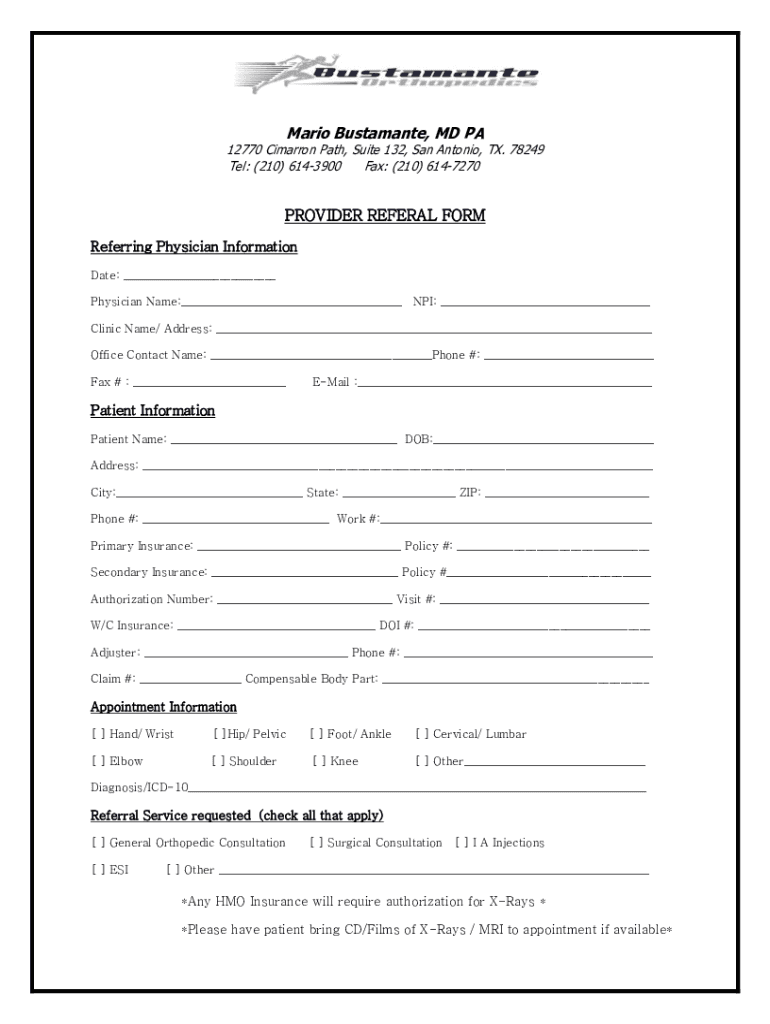 Mario Bustamante, MD PA12770 Cimarron Path, Suite 132, San Antonio, TX. 78249 Tel: (210) 6143900 Fax: (210) 6147270PROVIDER REFERRAL FORM Referring Physician Information Date: ___ Physician Name:___NPI: