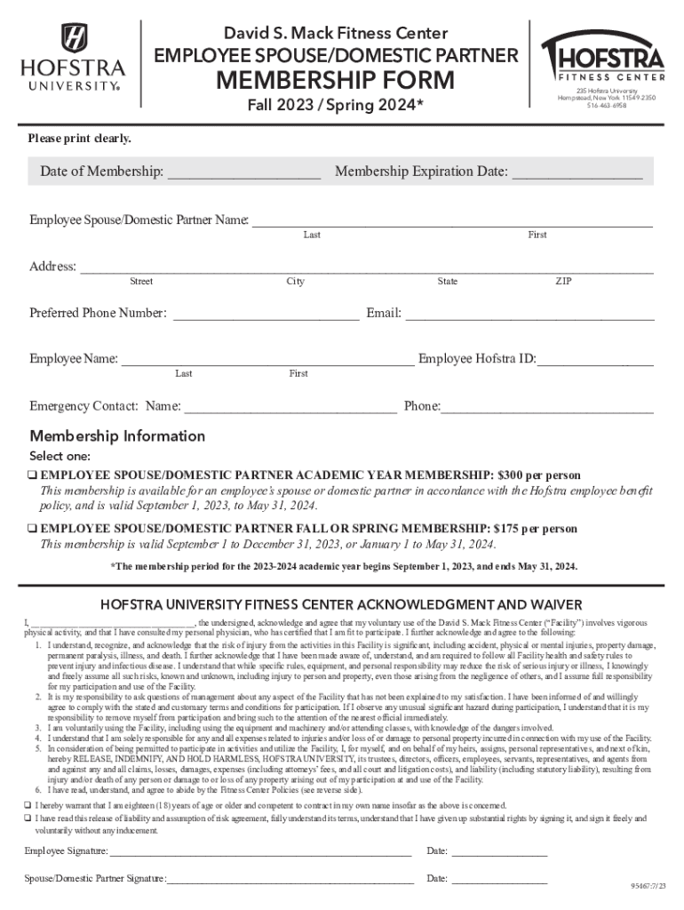 David S. Mack Fitness CenterEMPLOYEE SPOUSE/DOMESTIC PARTNERMEMBERSHIP FORM235 Host University Hempstead, New York 115492350 5164636958Fall 2023 / Spring 2024×Please print clearly. Date of Membership: