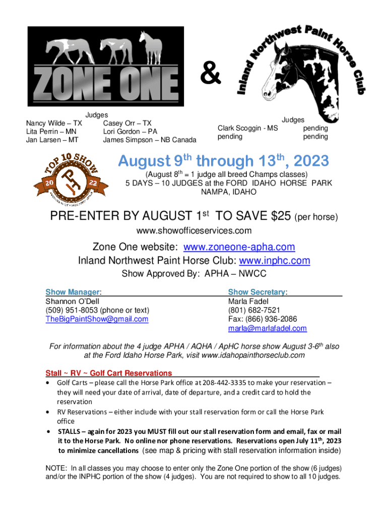 & Judges Nancy Wilde TX Casey Orr TX Lisa Person MN Lori Gordon PA Jan Larsen MT James Simpson NB Canada Judges Clark Slogging MS pending August 9th through 13th, 2023 (August 8th 1 judge all breed