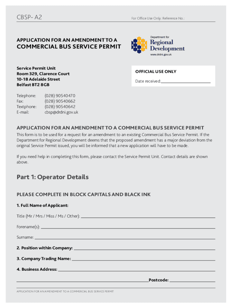 CSP A2For Office Use Only: Reference No.:APPLICATION FOR AN AMENDMENT TO COMMERCIAL BUS SERVICE PERMIT Unit Room 329, Clarence Court 1018 Adelaide Street Belfast BT2 8 GB Telephone:Fax:Text phone:Email:OFFICIAL