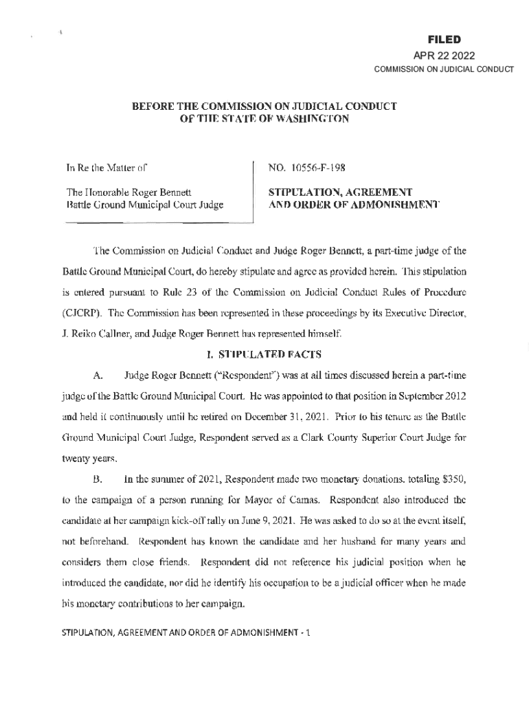 FILED APR 22 2022 COMMISSION ON JUDICIAL CONDUCTBEFORE THE COMMISSION ON JUDICIAL CONDUCT OF THE STATE OF Washingtonian Re the Matter NO. 10556F198ofThe Honorable Roger Bennett Battle Ground Municipal