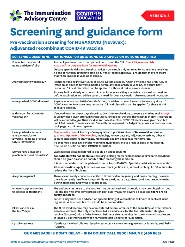 Vaccination screening for NUVAXOVID (Novavax):