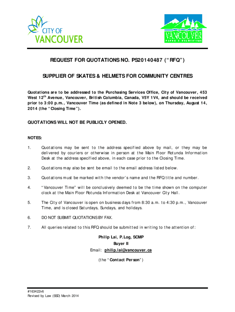 REQUEST FOR QUOTATIONS NO. PS20140487 (RFQ) SUPPLIER OF SKATES & HELMETS FOR COMMUNITY Centers Quotations are to be addressed to the Purchasing Services Office, City of Vancouver, 453 West 12th Avenue,