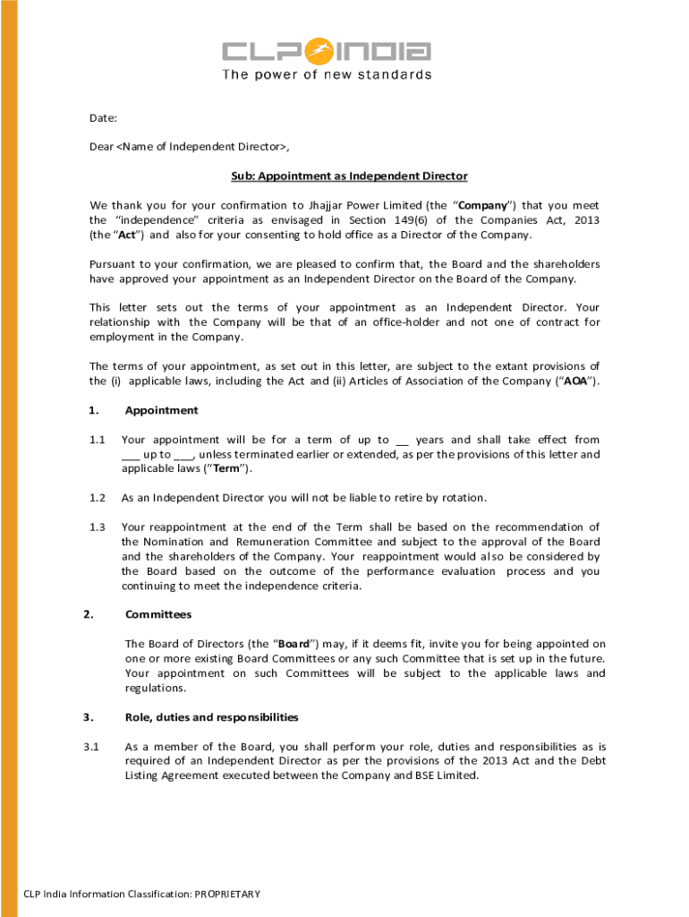 Date: Dear Name of Independent Director, Sub: Appointment as Independent Director We thank you for your confirmation to Hangar Power Limited (the Company) that you meet the independence criteria as