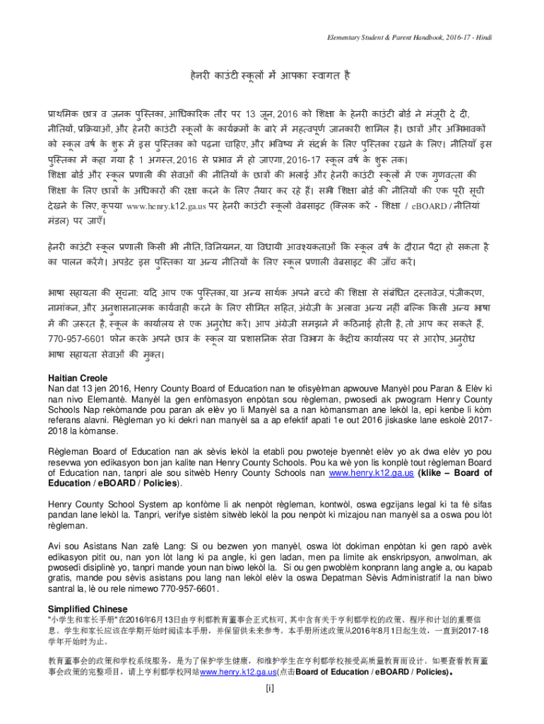 Elementary Student & Parent Handbook, 201617 Hindi, 13, 2016 ,,,