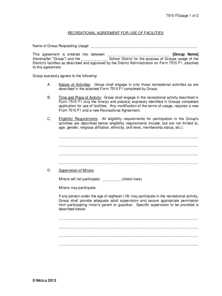 7510 F3/page 1 of 2RECREATIONAL AGREEMENT FOR USE OF FACILITIESName of Group Requesting Usage: ___ This agreement is entered into between ___ [Group Name] (hereinafter \” Group\”) and the ___