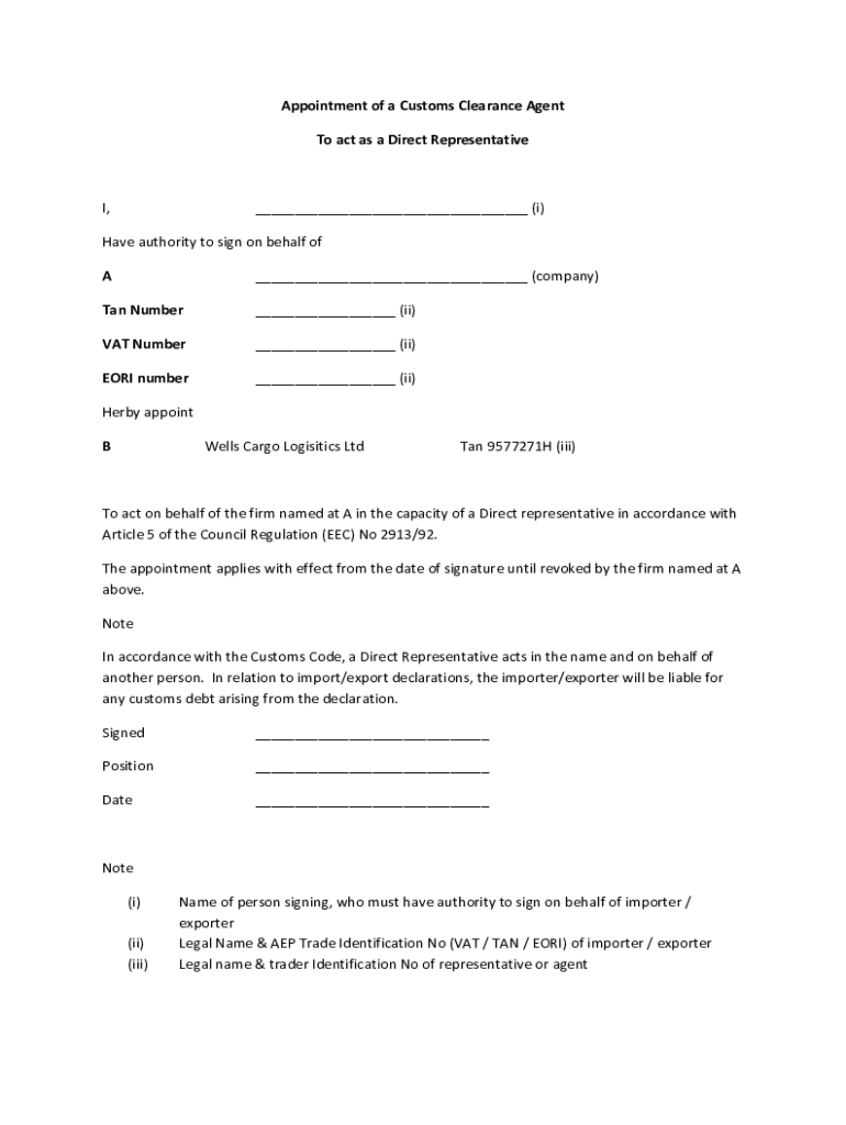 Get the free Wells Cargo - Appointment of a Customs Clearance Agent