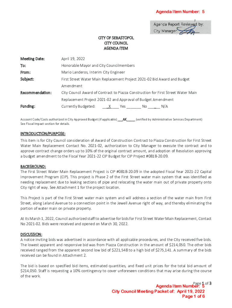 Get the free First Street Water Main Replacement Project 2021-02 Bid Award and Budget
