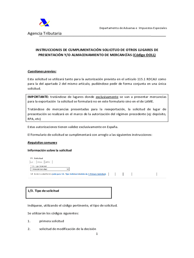 Este documento proporciona instrucciones sobre la cumplimentación de la solicitud para autorización de otros lugares de presentación y/o almacenamiento de mercancías, incluyendo requisitos, tipos