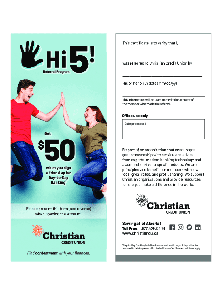 5! Referral Programs certificate is to verify that I, ___ was referred to Christian Credit Union by___ His or her birthdate (mm/dd/by)___ This information will be used to credit the account of the
