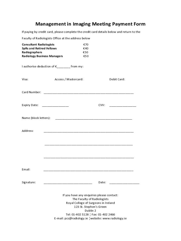 Management in Imaging Meeting Payment Form If paying by credit card, please complete the credit card details below and return to the Faculty of Radiologists Office at the address below Consultant