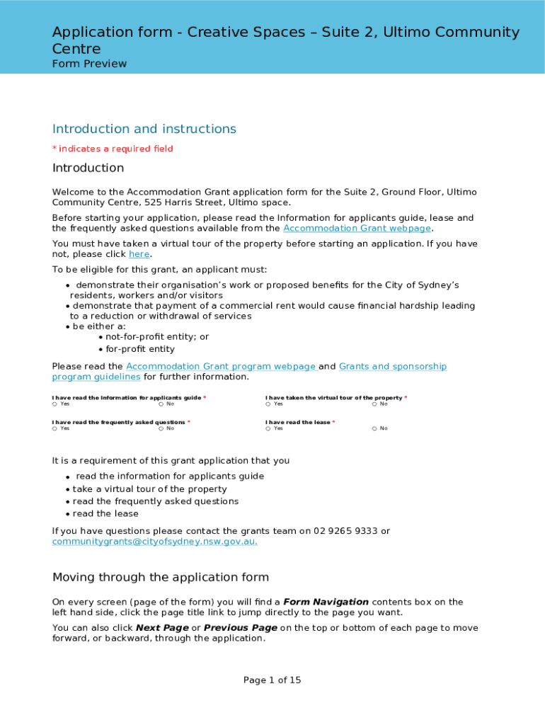 Application form Creative Spaces Suite 2, Ultimo Community Center Form PreviewIntroduction and instructions * indicates a required introduction Welcome to the Accommodation Grant application form