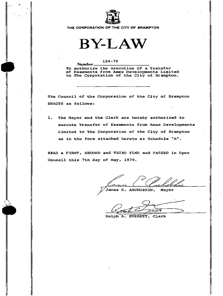 \'.\” THE CORPORATION OF THE CITY OF BRAMPTONBYLAW 10479 Number ___ _ To authorize the execution of a Transfer of Easements from Amex Developments Limited to The Corporation of the City of, Brampton.