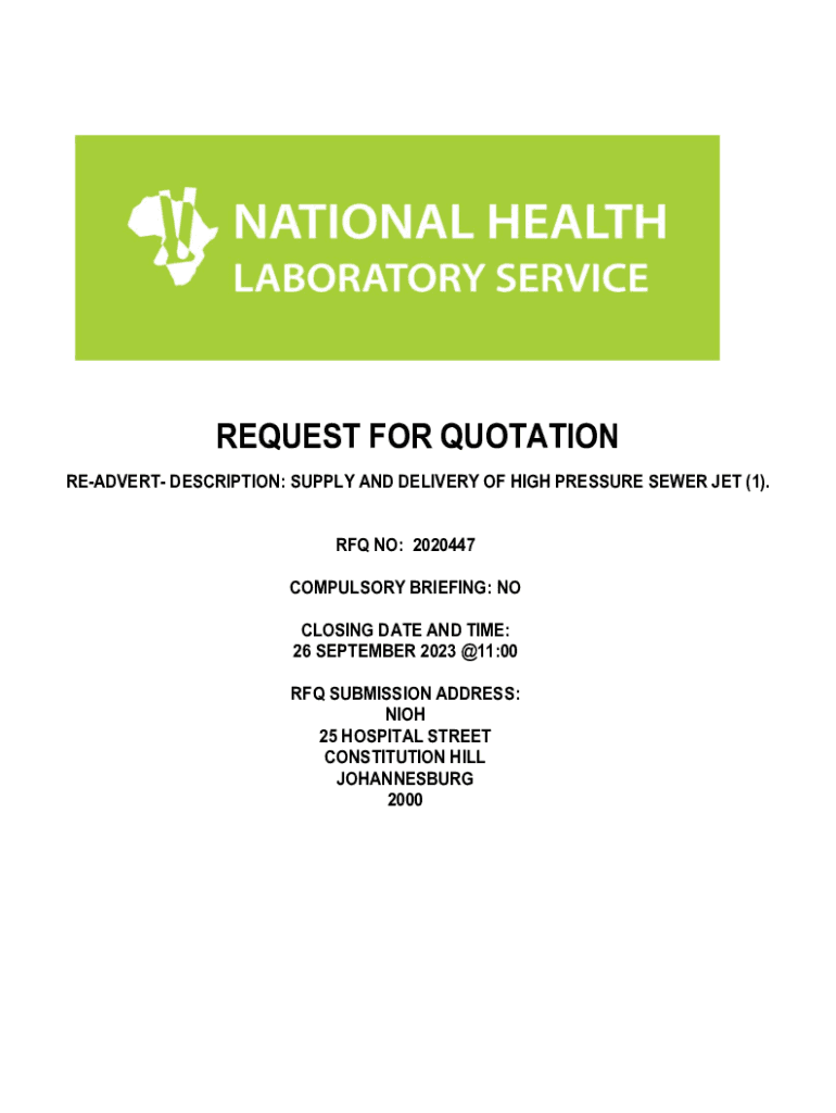 REQUEST FOR QUOTATION READERS DESCRIPTION: SUPPLY AND DELIVERY OF HIGH PRESSURE SEWER JET (1). RFQ NO: 2020447 COMPULSORY BRIEFING: NO CLOSING DATE AND TIME: 26 SEPTEMBER 2023 @11:00 RFQ SUBMISSION