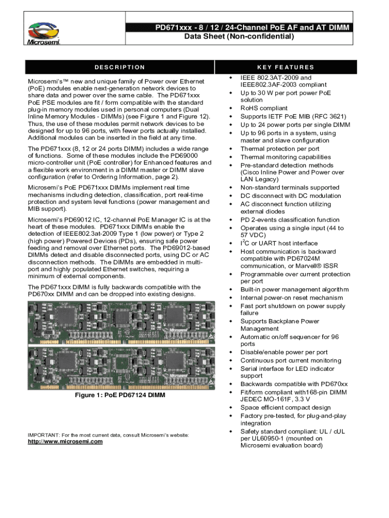 PD671xxx 8 / 12 / 24Channel POE AF and AT DIMM Data Sheet (Nonconfidential)DESCRIPTIONMicrosemis new and unique family of Power over Ethernet (POE) modules enable next generation network devices to