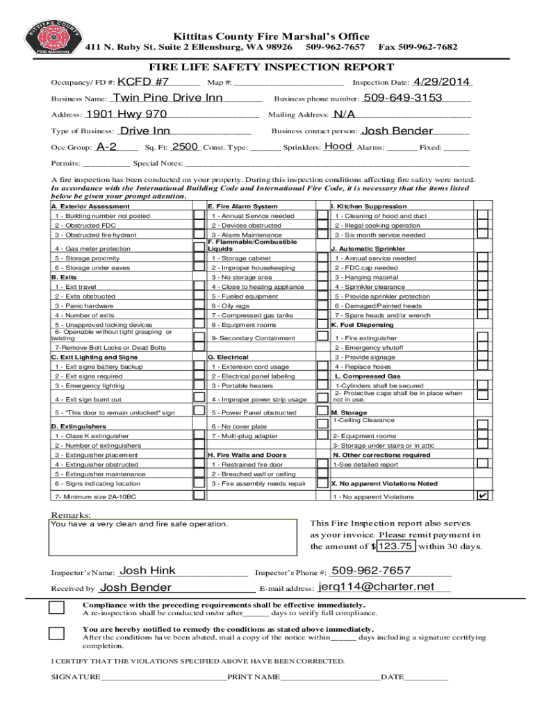 Hittites County Fire Marshals Office 411 N. Ruby St. Suite 2 Ellensburg, WA 989265099627657Fax 5099627682FIRE LIFE SAFETY INSPECTION REPORT Occupancy/ FD #: CFD ___ Map #: ___ #7 Business Name: ___