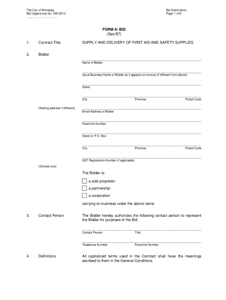 The City of Winnipeg Bid Opportunity No. 3002013Bid Submission Page 1 of 8Template Version: G220130321 Goods B ISOFORM A: BID (See B7) 1. Contract Title2. Undersupply AND DELIVERY OF FIRST AID AND