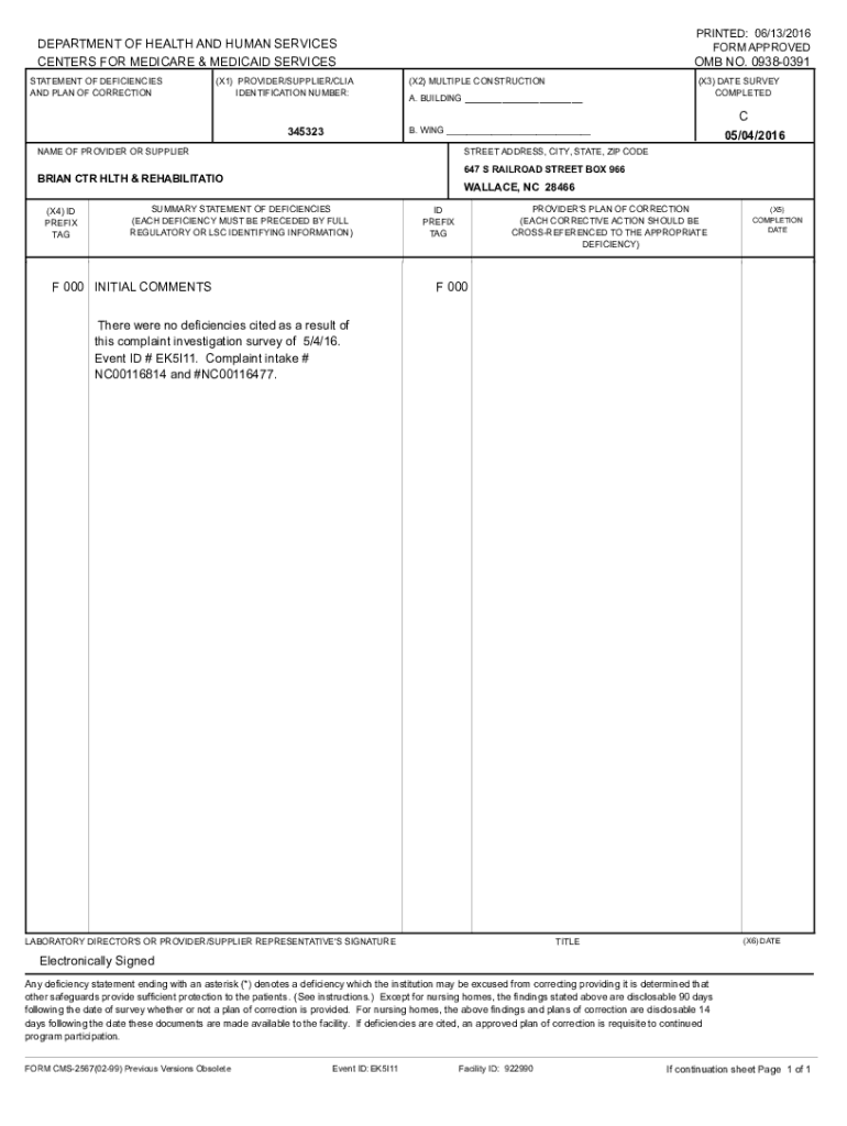 PRINTED: 06/13/2016 FORM APPROVEDDEPARTMENT OF HEALTH AND HUMAN SERVICES CENTERS FOR MEDICARE & MEDICAID SERVICES STATEMENT OF DEFICIENCIES AND PLAN OF CORRECTION(X1) PROVIDER/SUPPLIER/CIA IDENTIFICATION
