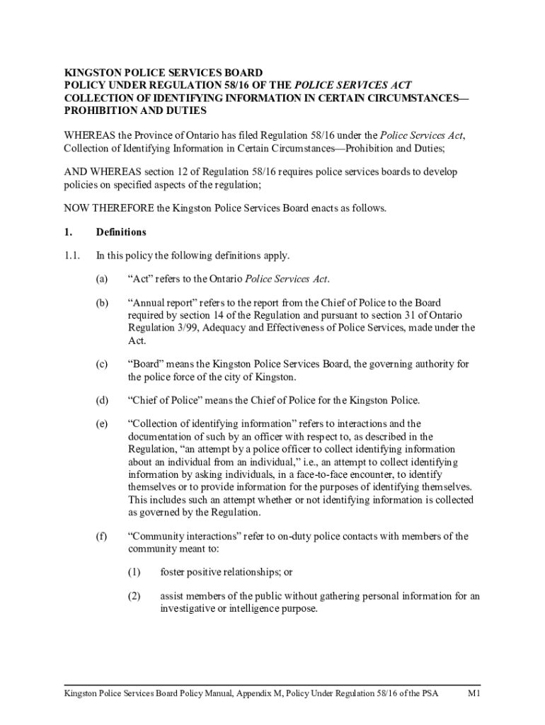 KINGSTON POLICE SERVICES BOARD POLICY UNDER REGULATION 58/16 OF THE POLICE SERVICES ACT COLLECTION OF IDENTIFYING INFORMATION IN CERTAIN CIRCUMSTANCES PROHIBITION AND DUTIES WHEREAS the Province of