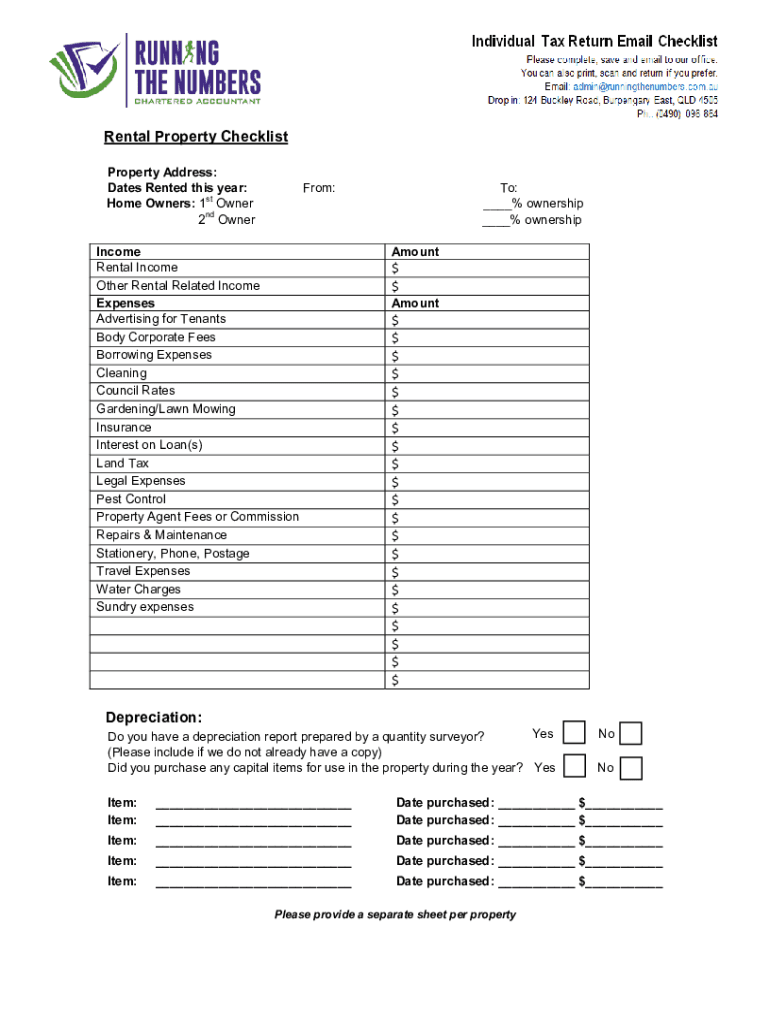 Rental Property Checklist Property Address: Dates Rented this year: st homeowners: 1 Owner ND 2 Owner: ___% ownership ___% ownershipFrom:Income Rental Income Other Rental Related Income Expenses Advertising