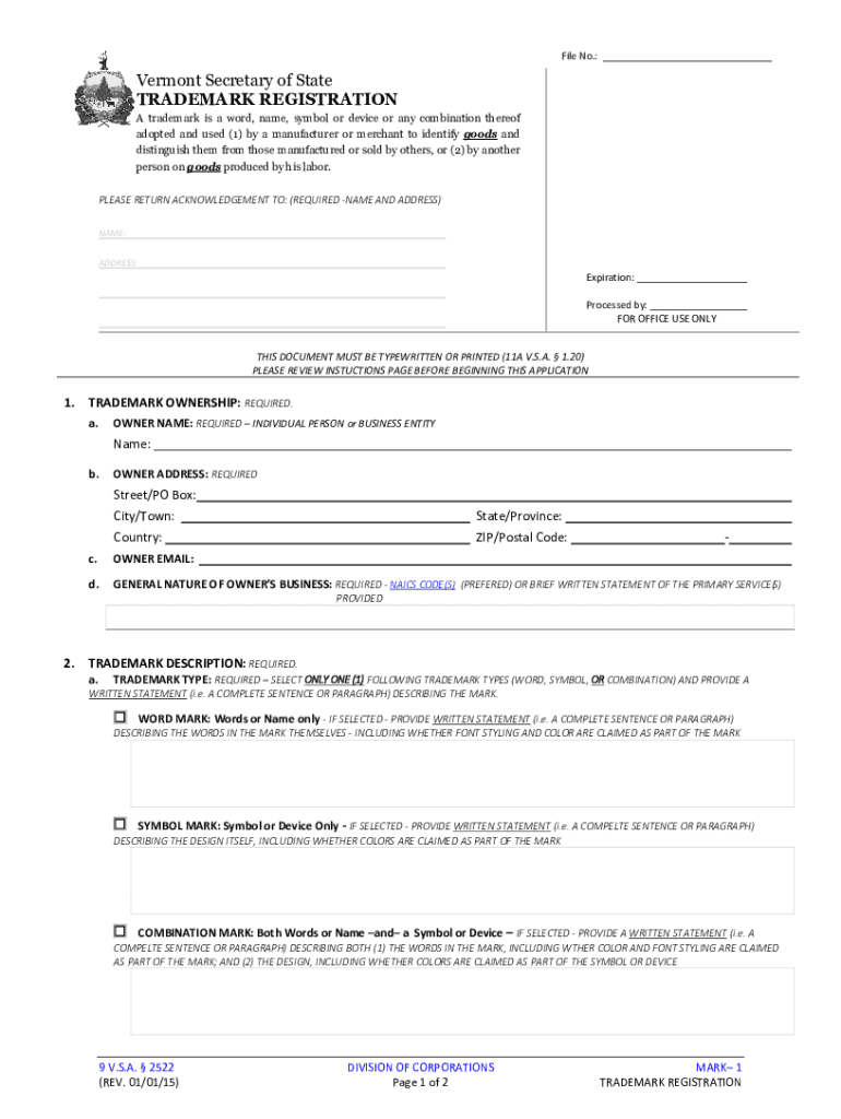 File No.:Vermont Secretary of State TRADEMARK REGISTRATION A trademark is a word, name, symbol or device or any combination thereof adopted and used (1) by a manufacturer or merchant to identify goods