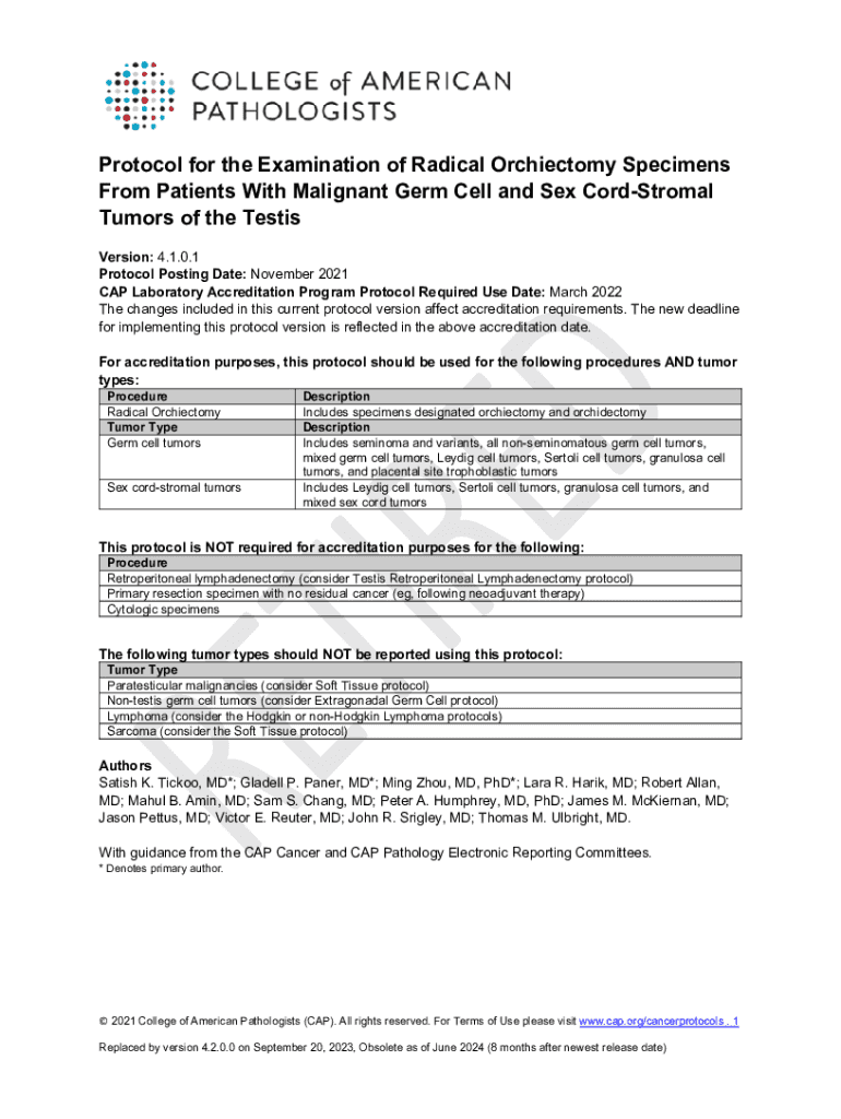 Protocol for the Examination of Radical Craniectomy Specimens From Patients With Malignant Germ Cell and Sex Nordstrom Tumors of the Testis Version: 4.1.0.1 Protocol Posting Date: November 2021 CAP