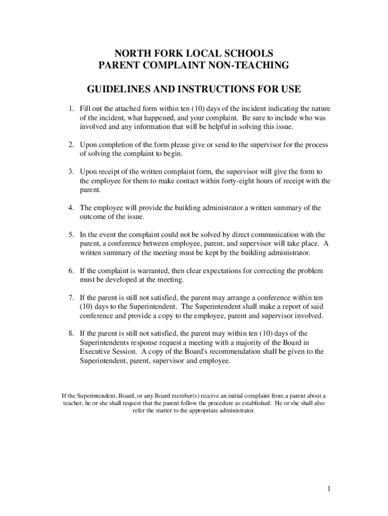 NORTH FORK LOCAL SCHOOLS PARENT COMPLAINT TEACHING GUIDELINES AND INSTRUCTIONS FOR USE 1. Fill out the attached form within ten (10) days of the incident indicating the nature of the incident, what