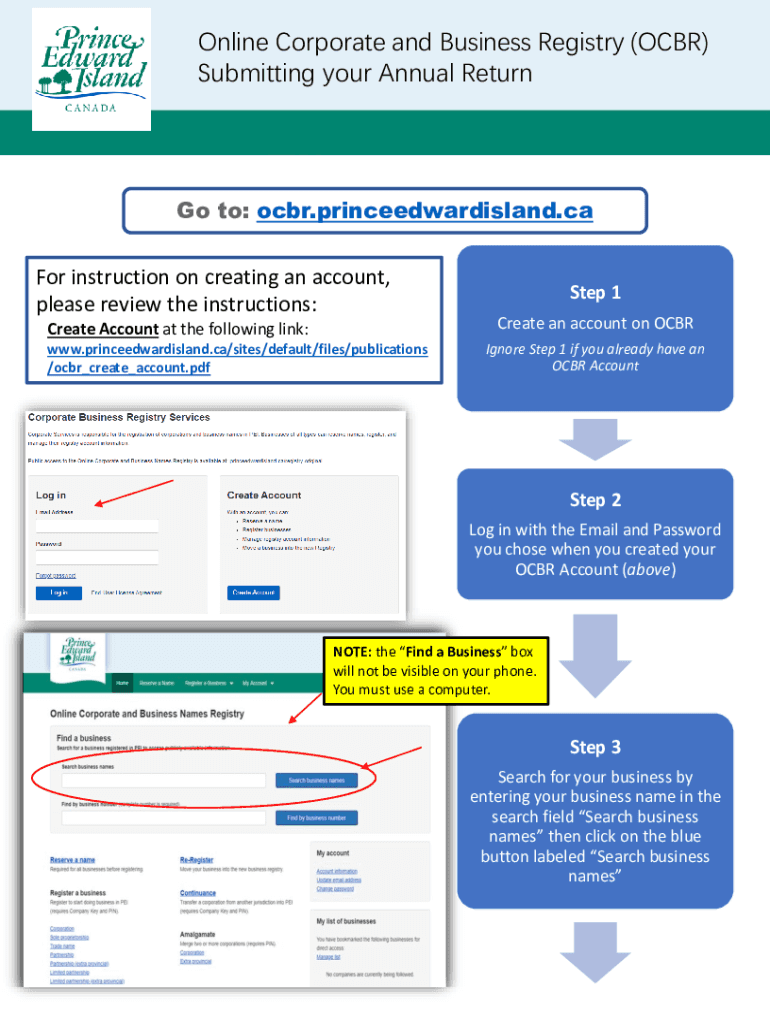 Online Corporate and Business Registry (OCR) Submitting your Annual Return to: OCR.princeedwardisland.for instruction on creating an account, please review the instructions: Create Account at the