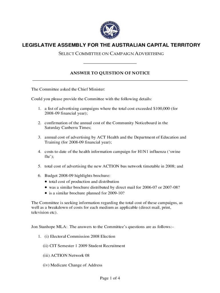 LEGISLATIVE ASSEMBLY FOR THE AUSTRALIAN CAPITAL TERRITORY SELECTCOMMITTEEONCAMPAIGNADVERTISING ___ ANSWERTOQUESTIONOFNOTICE ___ The Committee asked the Chief Minister: Could you please provide the