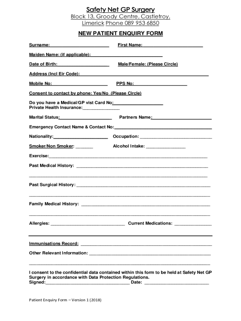 Safety Net GP SurgeryBlock 13, Goody Center, Castle troy, Limerick Phone 089 953 6850NEW PATIENT Inquiry FORM Surname:___First Name: ___Maiden Name: (if applicable):___ Date of Birth:___Male/Female: