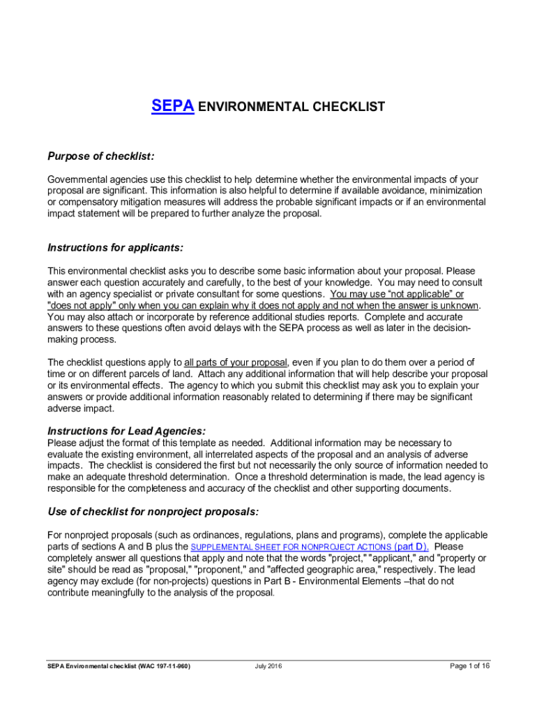 SEPA ENVIRONMENTAL CHECKLIST Purpose of checklist: Governmental agencies use this checklist to help determine whether the environmental impacts of your proposal are significant. This information is