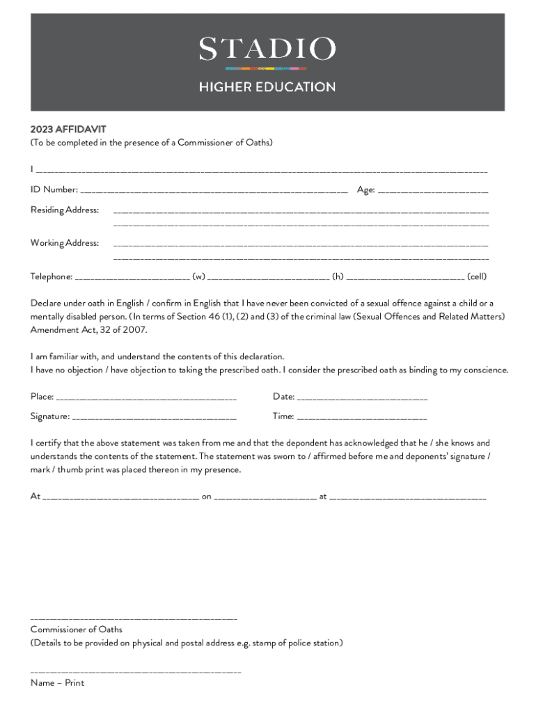 2023 AFFIDAVIT (To be completed in the presence of a Commissioner of Oaths) I ___ ID Number: ___ Age: ___ Residing Address:___ ___Working Address:___ ___Telephone: ___ (w) ___ (h) ___ (cell) Declare