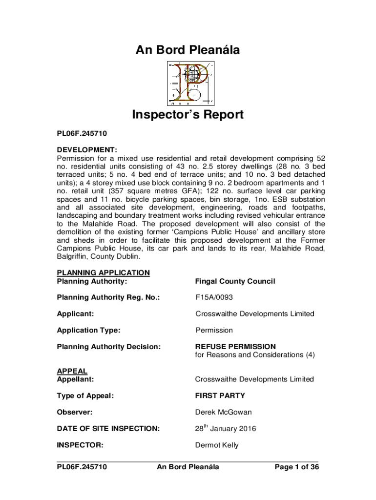 A Born PleanlaInspectors Report PL06F.245710 DEVELOPMENT: Permission for a mixed use residential and retail development comprising 52 noes. residential units consisting of 43 no. 2.5 story dwellings