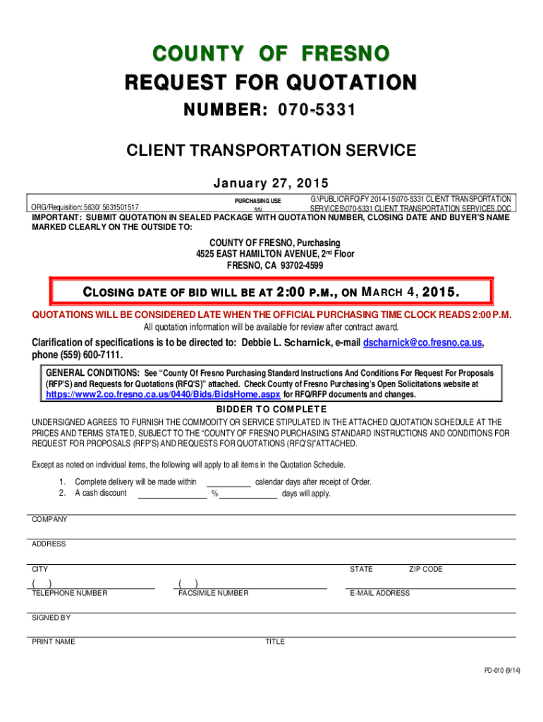 C O U N TY O F FR ESN O R E Q U EST FO R Q U O TA TO N NUMBER: 0705331 CLIENT TRANSPORTATION SERVICE January 27, 2015, G:PUBLICRFQFY 2014150705331 CLIENT TRANSPORTATION PURCHASING USE ORG/Requisition: