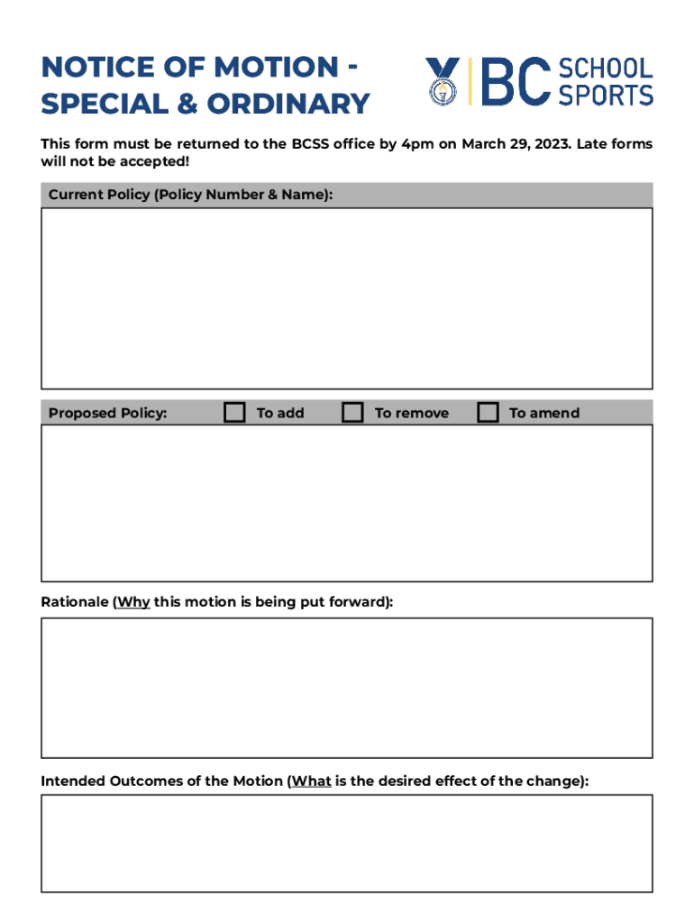 NOTICE OF MOTION SPECIAL & ORDINARY This form must be returned to the BASS office by 4pm on March 29, 2023. Late forms will not be accepted! Current Policy (Policy Number & Name):Proposed Policy:To
