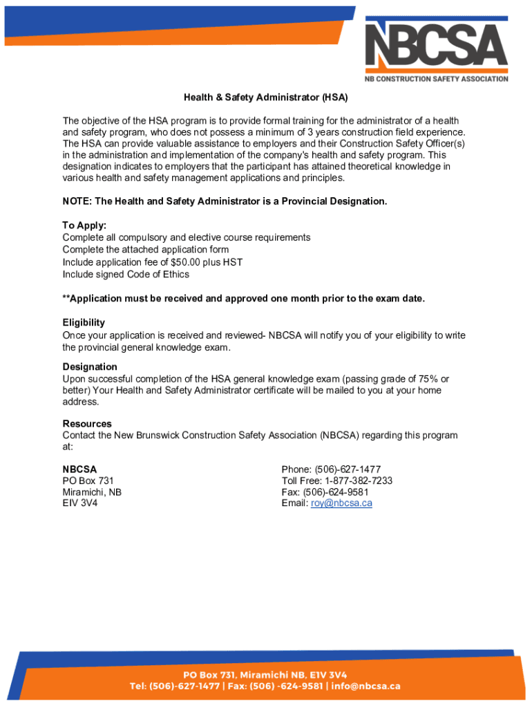 Health & Safety Administrator (HSA) The objective of the HSA program is to provide formal training for the administrator of a health and safety program, who does not possess a minimum of 3 years construction