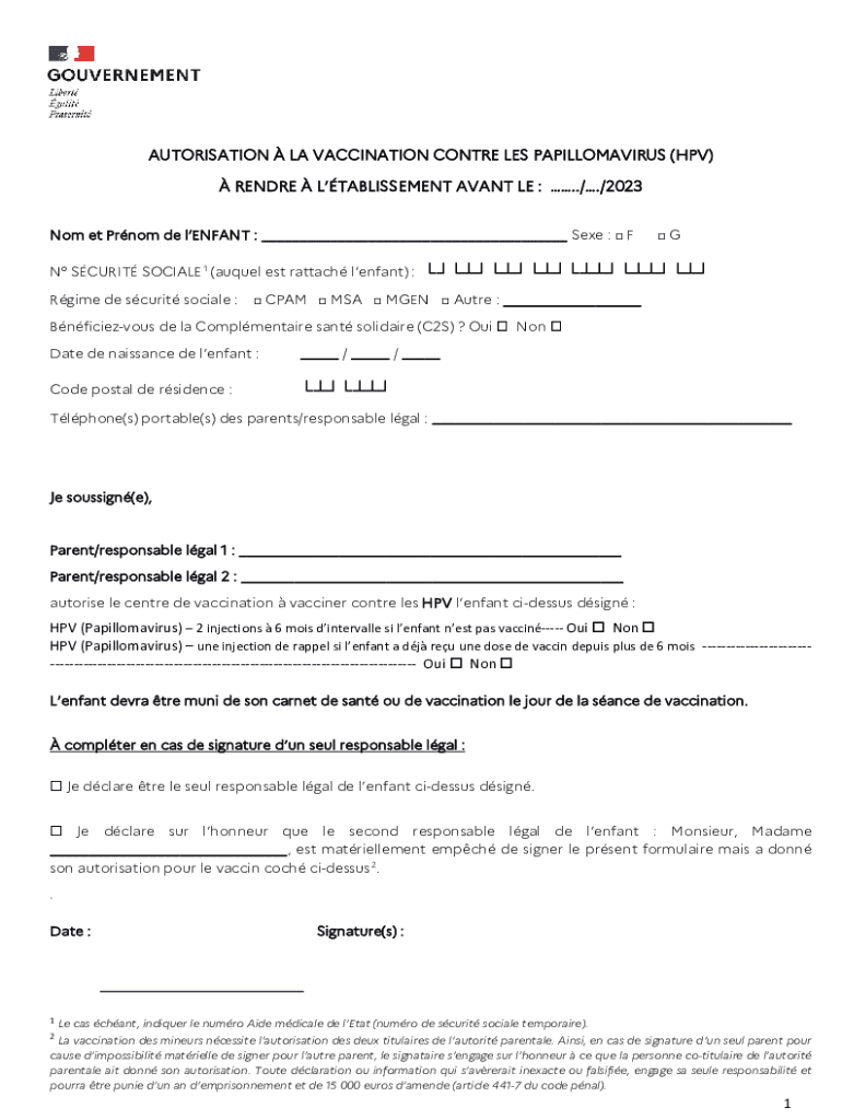 AUTHORIZATION LA VACCINATION CONTRA LES PAPILLOMAVIRUS (HPV) REND RE LTABLISSEMENT SAVANT LE :././2023 No met Prom DE Enfant : ___ See : F N SECURITY SOCIAL 1 (sequel est attach Enfant) : Regime DE