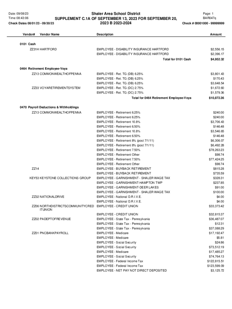 Shale Area School District SUPPLEMENT C.1A OF SEPTEMBER 13, 2023, FOR SEPTEMBER 20, Check Dates 08/01/23 09/30/23 2023 B 20232024 Date: 09/08/23 Time: 08:43:06Vendor#Vendor Name Page: 1 BAR047q Check