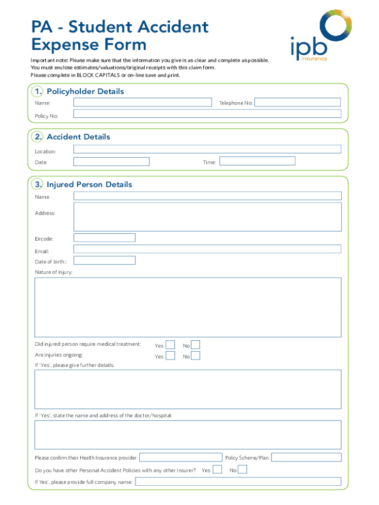 PA Student Accident Expense Form Important note: Please make sure that the information you give is as clear and complete as possible. You must enclose estimates/valuations/original receipts with this