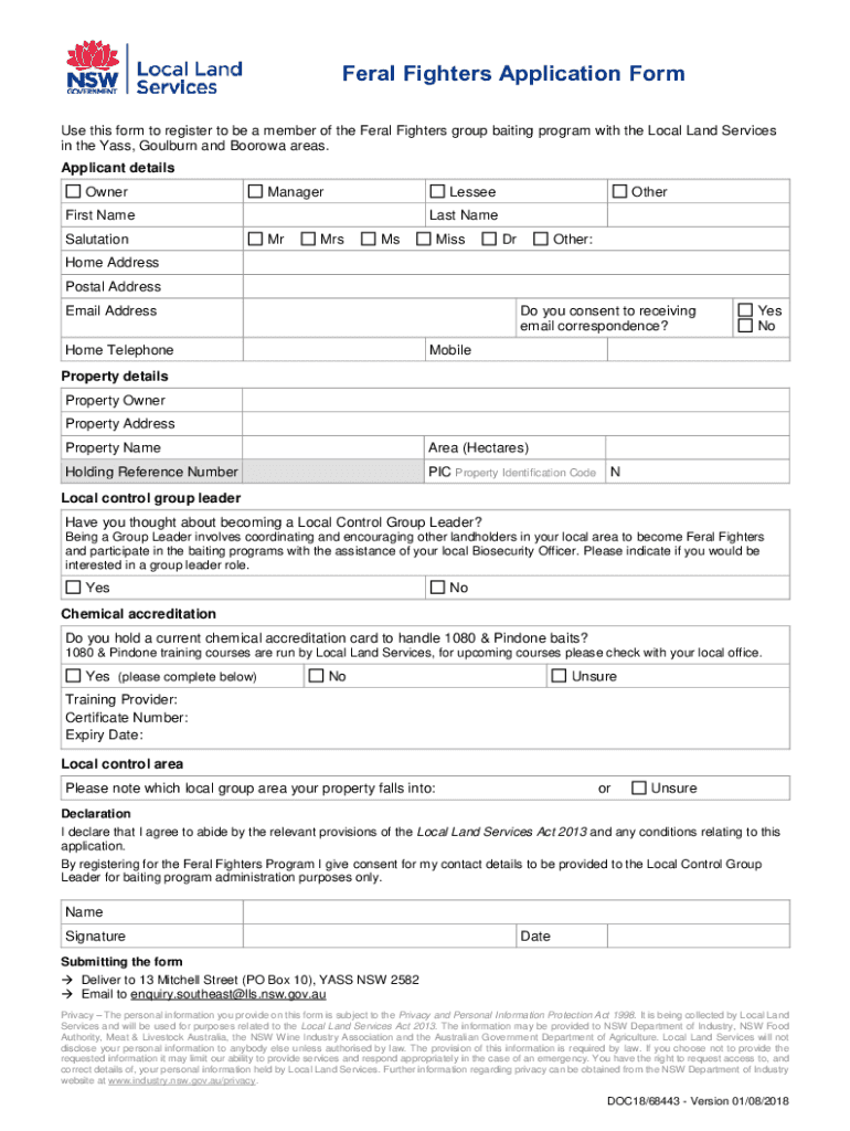 Uses this form to register to be a member of the Feral Fighters group baiting program with the Local Land Services