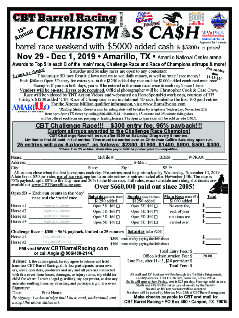 An Christmas Ca$hApproved for 4 circuits barrel race weekend with $5000 added cash & $5300+ in prizes!
