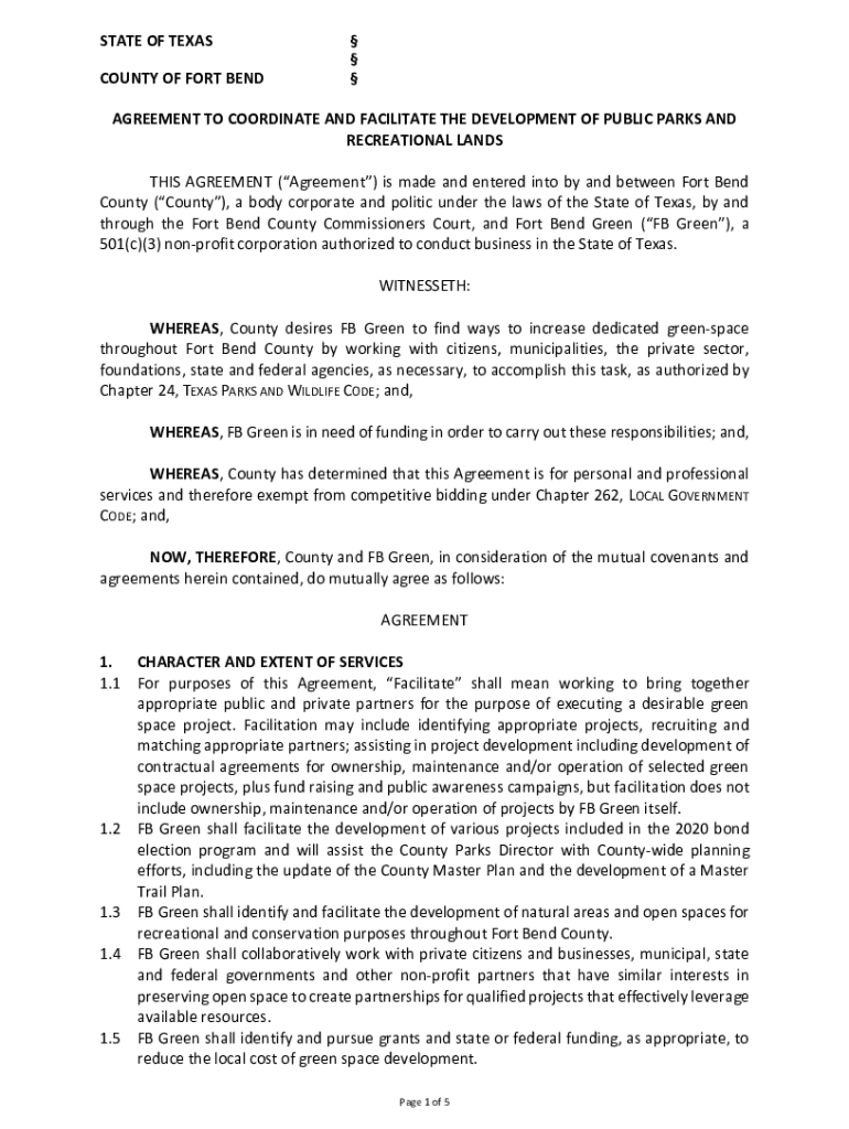 STATE OF TEXAS COUNTY OF FORT BEND AGREEMENT TO COORDINATE AND FACILITATE THE DEVELOPMENT OF PUBLIC PARKS AND RECREATIONAL LANDS THIS AGREEMENT (Agreement) is made and entered into by and between
