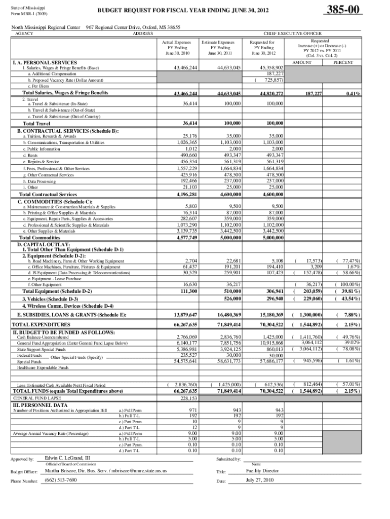State of Mississippi Form MBR1 (2009)North Mississippi Regional Center38500BUDGET REQUEST FOR FISCAL YEAR ENDING JUNE 30, 2012 967 Regional Center Drive, Oxford, MS 38655AGENCYADDRESSCHIEF EXECUTIVE