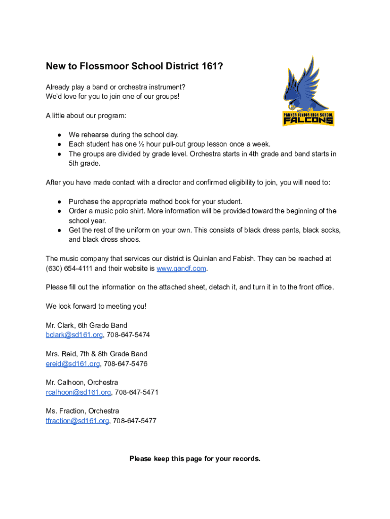 New to Floss moor School District 161? Already play a band or orchestra instrument? We'd love for you to join one of our groups! A little about our program: We rehearse during the school day. Each