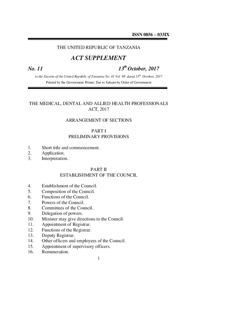 No. 11The Medical, Dental And Allied Health Professionals Act2017ISSN 0856 033IX THE UNITED REPUBLIC OF TANZANIA SUPPLEMENT 13th October, 2017No. 11to the Gazette of the United Republic of Tanzania