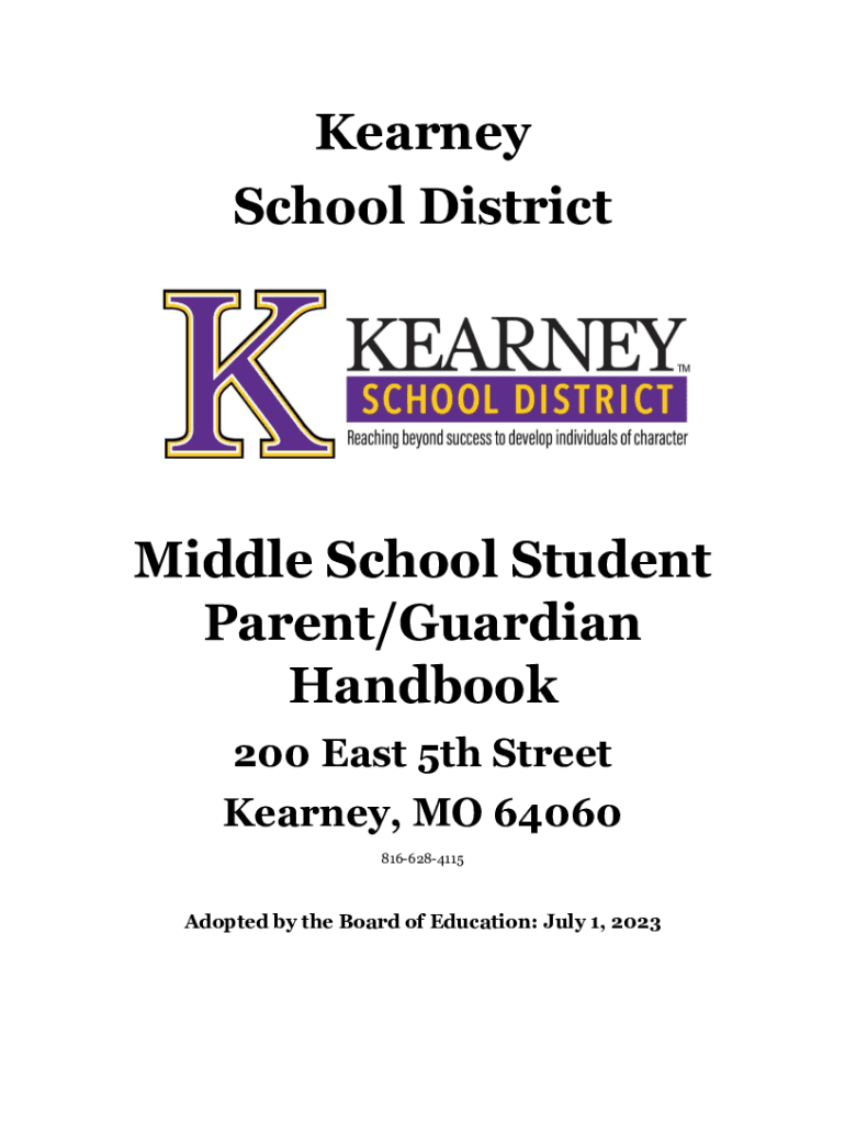 Kearney School DistrictMiddle School Student Parent/Guardian Handbook 200 East 5th Street Kearney, MO 64060 8166284115Adopted by the Board of Education: July 1, 2023Contents Mission C110S ...................................................................................................................................................