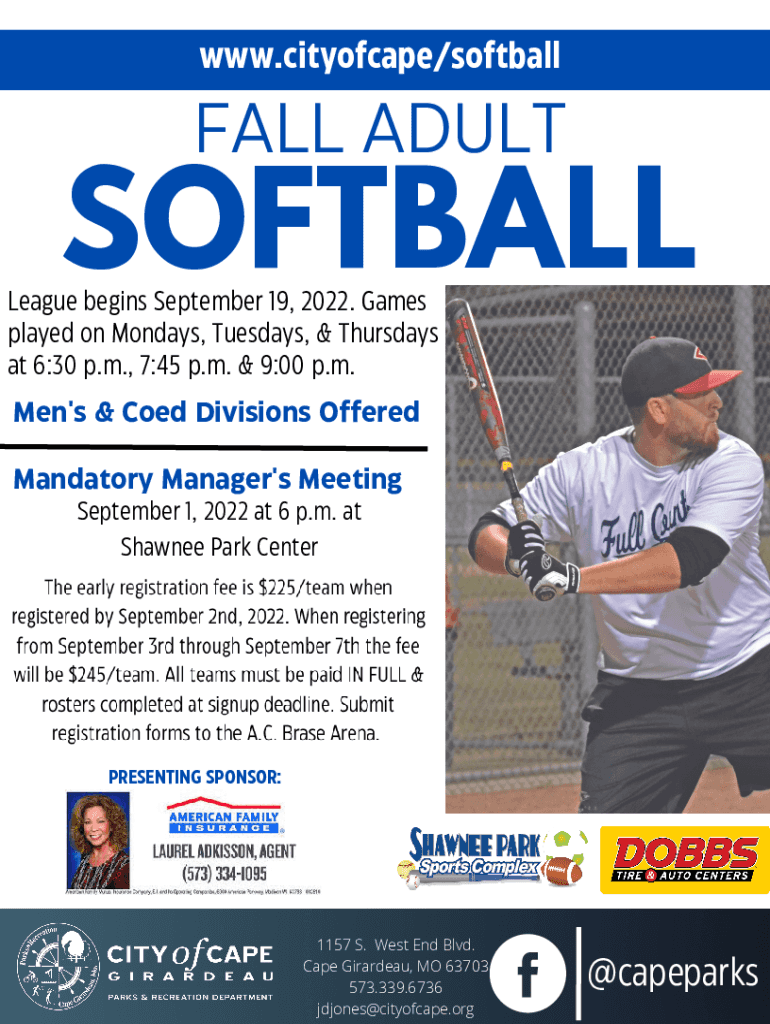 Www.cityofcape/softballFALL ADULTSOFTBALLLeague begins September 19, 2022. Games played on Mondays, Tuesdays, & Thursdays at 6:30 p.m., 7:45 p.m. & 9:00 p.m. Men\'s & Coed Divisions Offered Mandatory