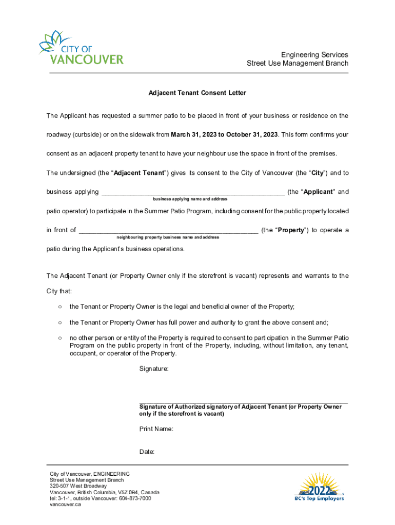 Engineering Services Street Use Management BranchAdjacent Tenant Consent Letter The Applicant has requested a summer patio to be placed in front of your business or residence on the roadway (curbside)