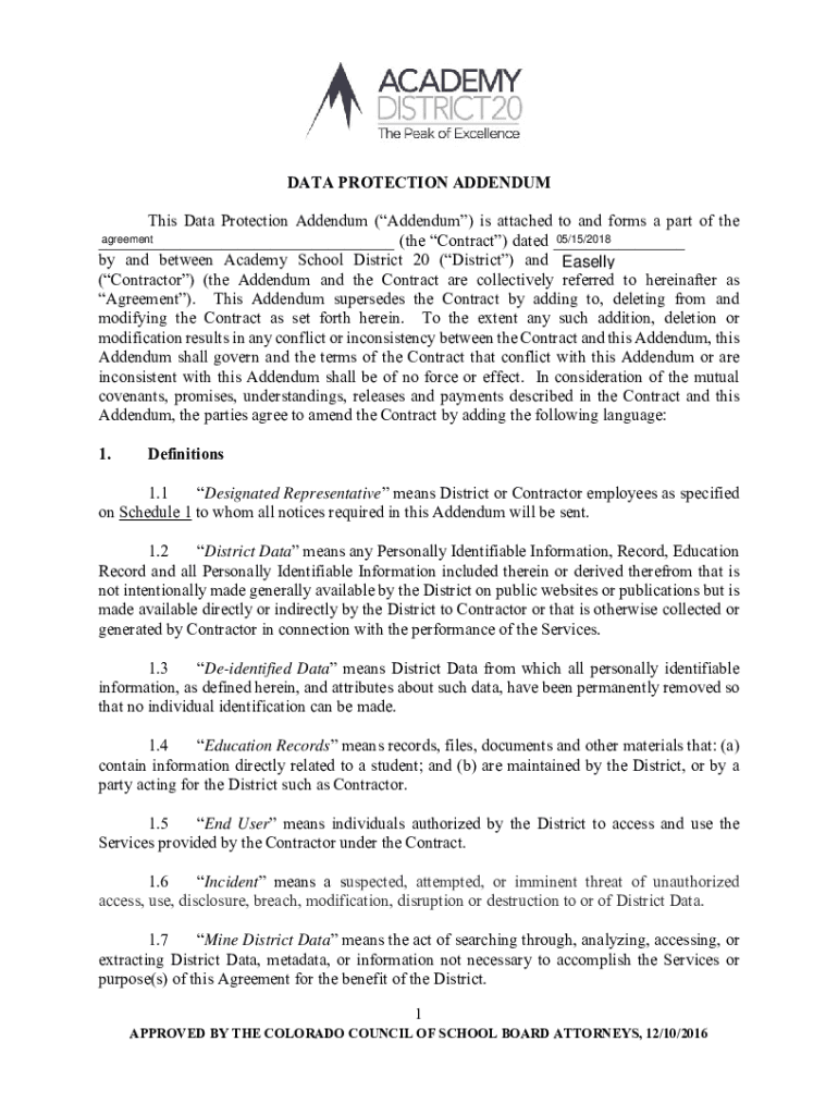 DATA PROTECTION ADDENDUM This Data Protection Addendum (Addendum) is attached to and forms a part of the agreement 05/15/2018 ___ (the Contract) dated ___ by and between Academy School District 20